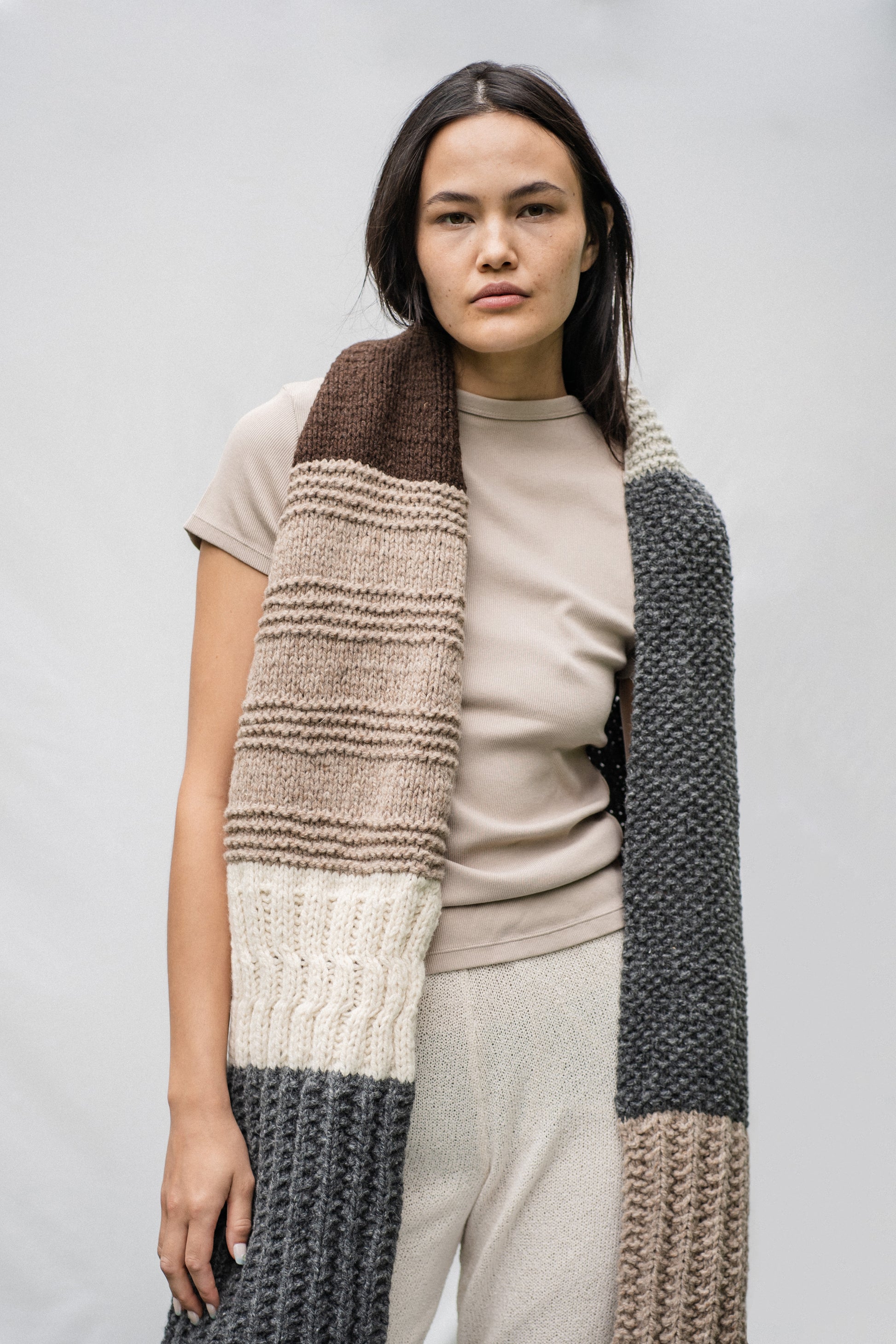 Handcrafted from leftover German merino yarn from other ANN pieces, the Leila Scarf features a consistent patchwork design, with colors varying depending on the yarns available. Soft, breathable, and generously sized, it offers cozy warmth while supporting sustainable, waste-free production.